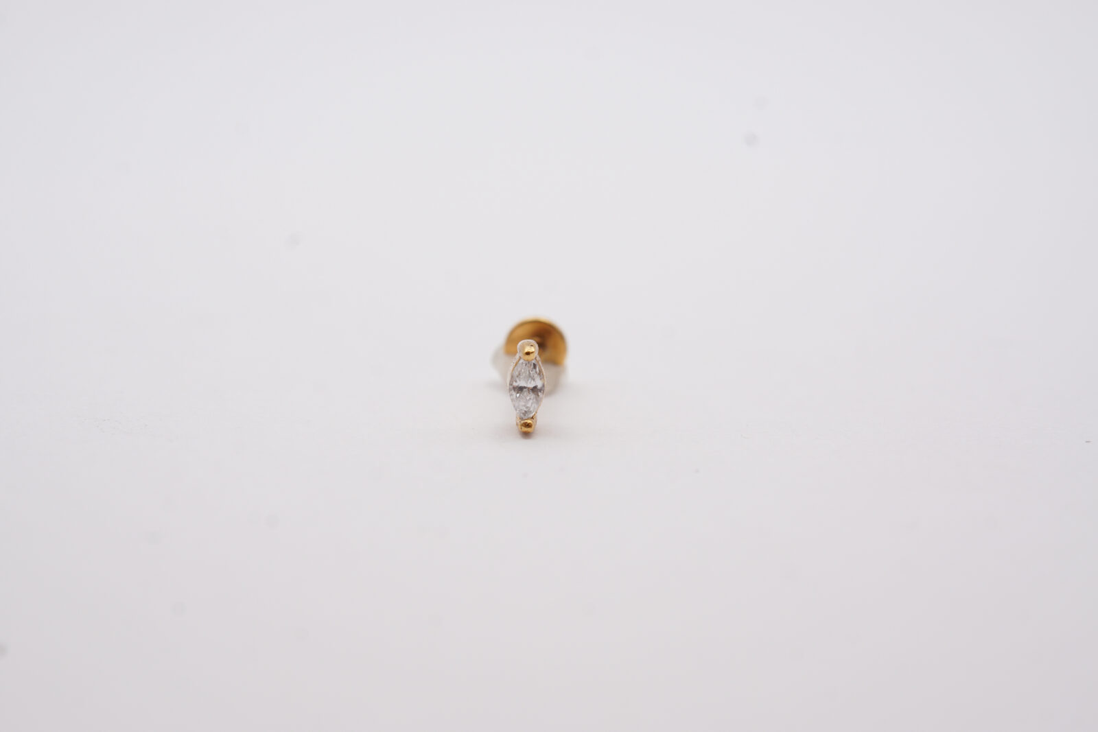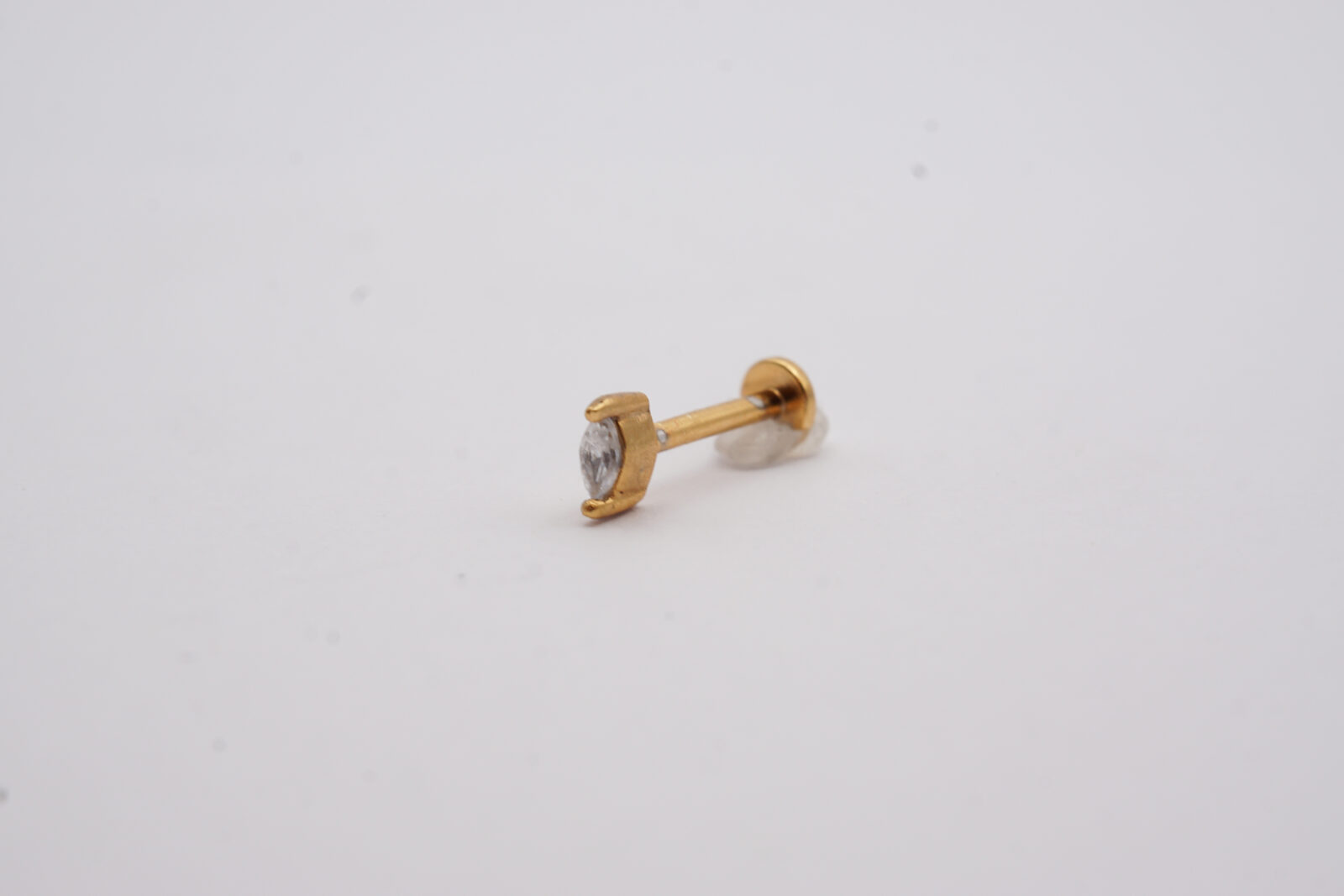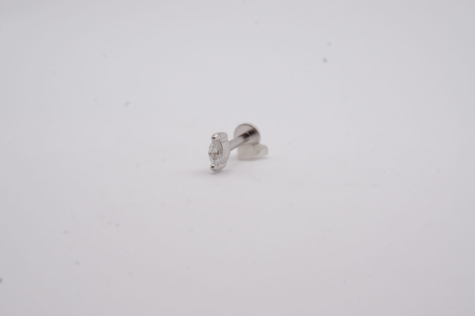 Fijne handgemaakte piercing met een ovale zirconia en platte achterkant. Verkrijgbaar in zilver, goldplated en 14k. Buislengte 6.5 mm en buisdikte 1 mm.